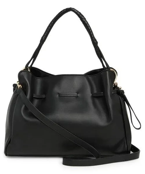 This Badgley Mischka hobo bag is a stylish and versatile addition to any wardrobe. The exterior features a beautiful combination of solid black vegan leather, with gold-plated hardware and bottom studs that add a touch of elegance. The bag is medium-sized, measuring 13 inches in width, 10 inches in height, and 4 inches in depth, and it has a drawstring closure that keeps your belongings secure.