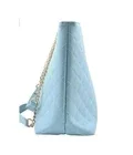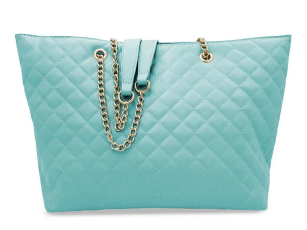 The Badgley Mischka Light Sky Blue Quilted Large Tote Bag Purse is a stylish and spacious accessory designed for women on the go. Made from vegan leather, this tote features a chic quilted finish in a light sky blue color. The gold chain hardware adds a touch of luxury to the overall design, making it a versatile and fashionable choice for everyday use.