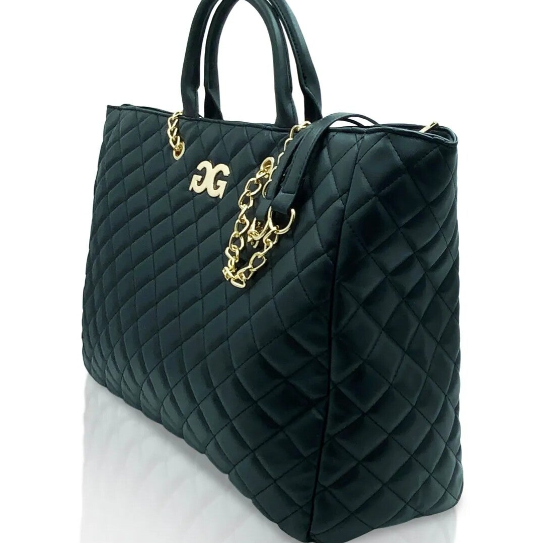 This Gilda Paris Large Quilted Tote Bag features a solid black-colored exterior made of leather with a quilted finish. The bag has a zip closure and is adorned with a "G" logo quilted design.
