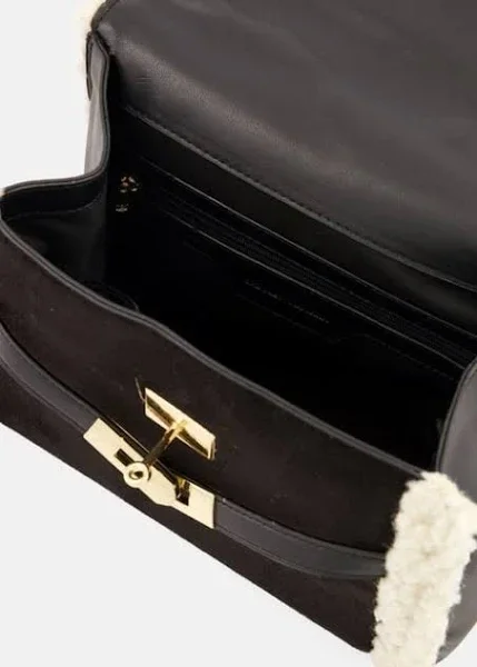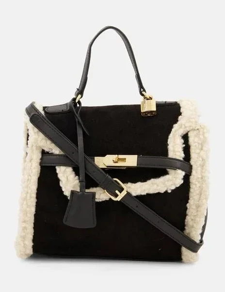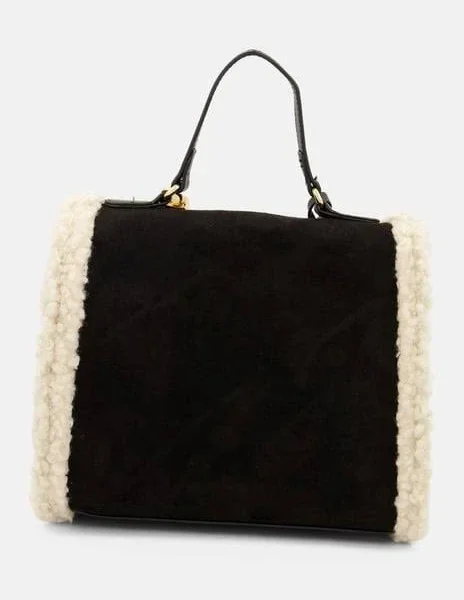 Badgley Mishka Faux Suede/Fur Border Satchel bag brand new with tags. It is a black faux suede look with faux fur trim and has a unique closure clasp with gold trim. There is a lock provided and a key hidden in the designer emblem that is attached