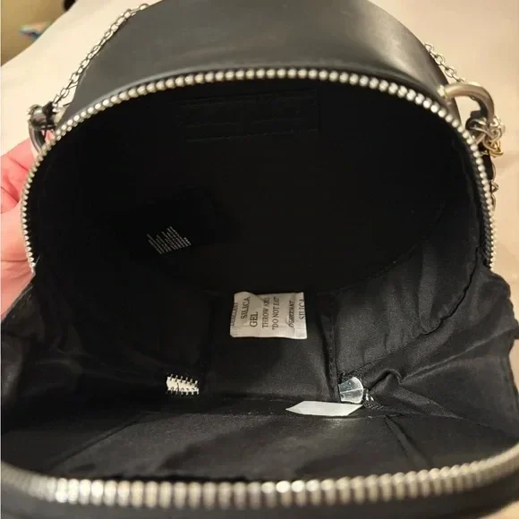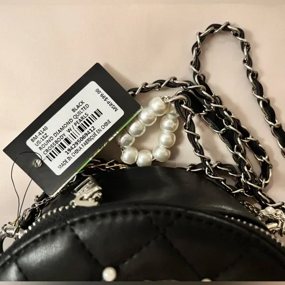This round bag showcases a plush diamond quilted leather design accented with pearls. Its size and elegant chain strap make it a sophisticated accessory for any occasion. The Crossbody is chain with leather and pearls. There are three strands of chain and pearl adding additional charm at the top of the bag.