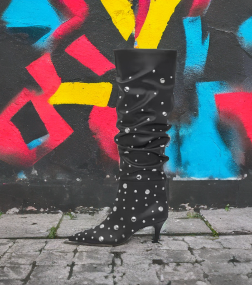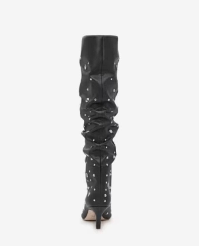 The product is a pair of Jessica Simpson women's black studded tall slouch boots in size 7.5 medium. These stylish boots feature a wide calf width and a synthetic upper material with studded accents, adding a trendy touch to the design. The slouch style gives a casual yet fashionable look, & a sexy kitten heel perfect for any outfit. With a comfortable shoe width of medium these boots are great for a concert or party.
