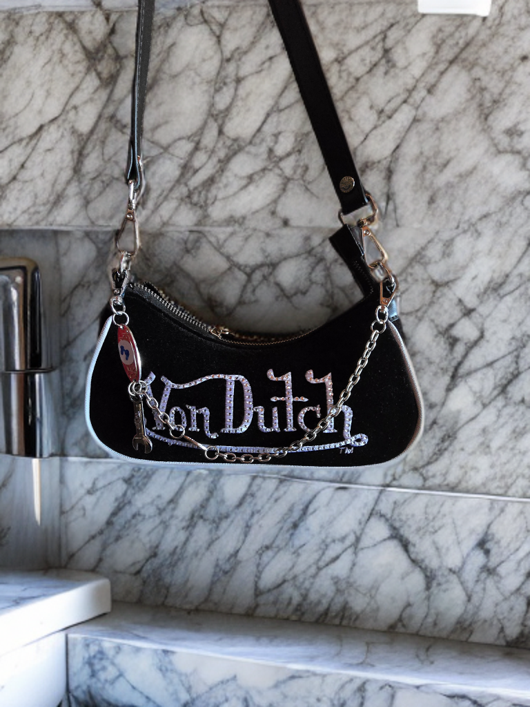 This Von Dutch bag is beautiful with its velvety exterior & this silver chain. All the letters are bedazzled with crystals. Take this bag from day to evening and be stunning!