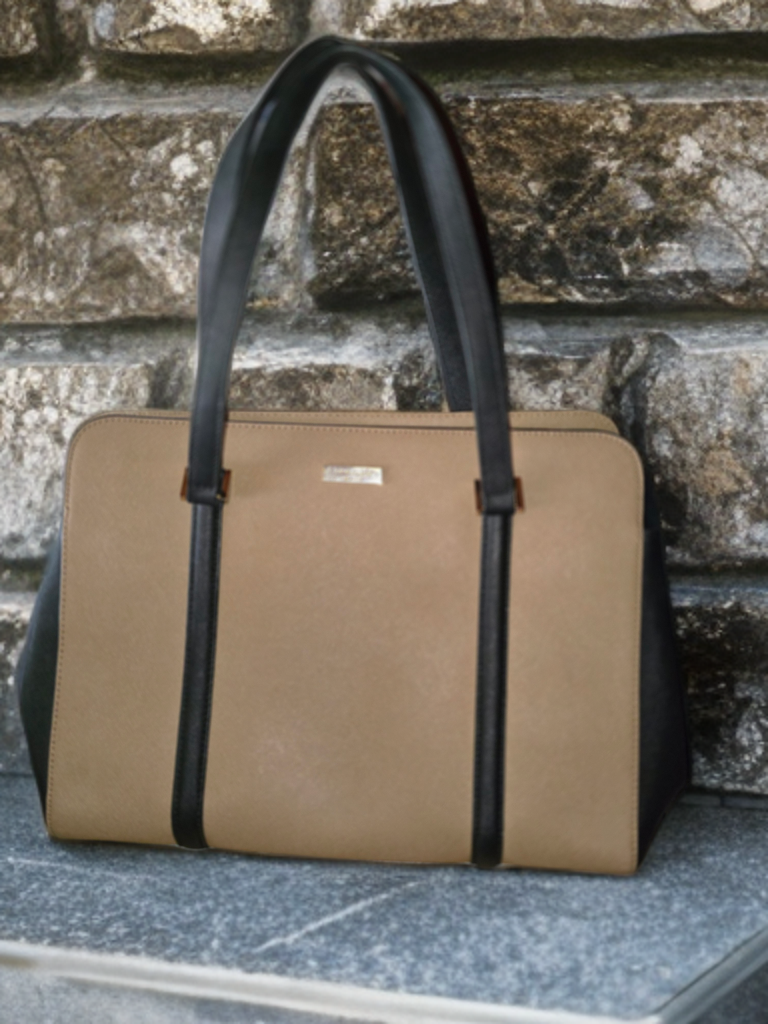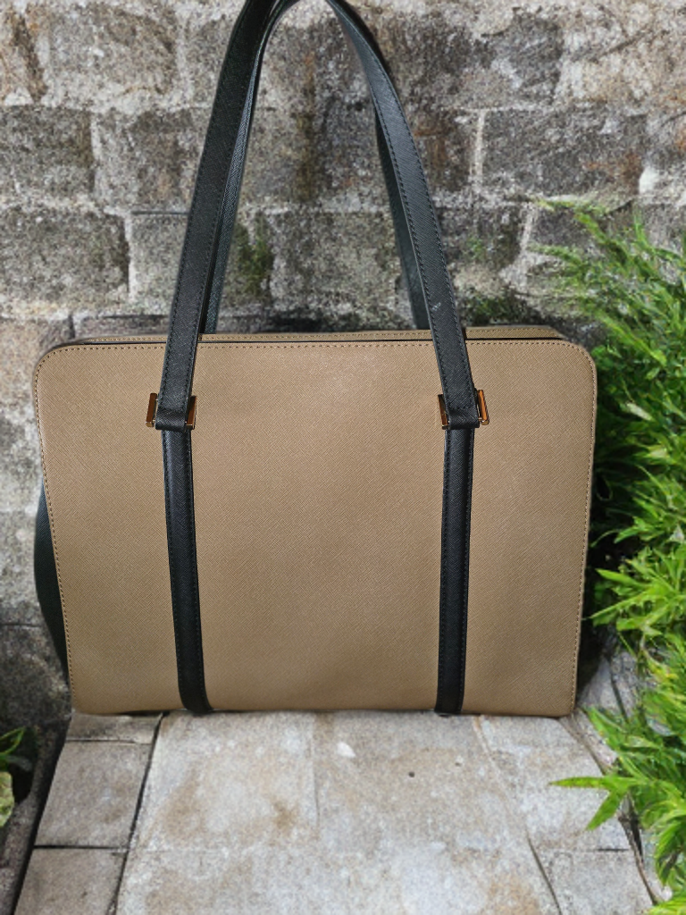 Kate Spade Newbury Lane Miles Bag Saffiano leather, dune and black. with gold-tone hardware, dual flat shoulder straps, tonal stitching throughout, tonal signature jacquard lining, three interior compartments; one with zip closure, three pockets at interior walls; one with zip closure and magnetic snap closures at top.