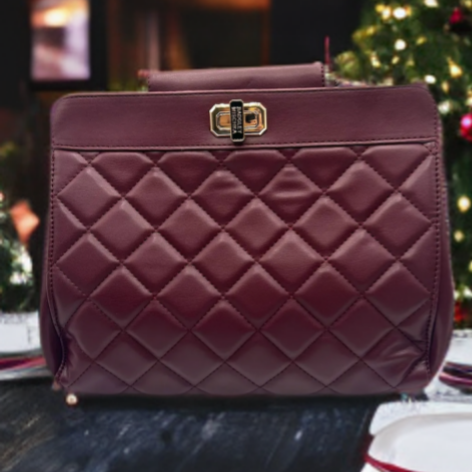 Badgley Mischka-Double Compartment Shoulder Bag Turn Lock/Adj Strap Elegant quilted handbag in a rich burgundy color. Perfect for any occasion. Plum Vegan Leather Double Compartment Shoulder Bag with Turn Lock and Detachable Strap. This fashionable bag for women is meticulously crafted from quilted vegan handbag material, striking the perfect balance between ethical choices and luxurious appeal. Ideal for the discerning woman who values luxury, functionality, and sustainability.